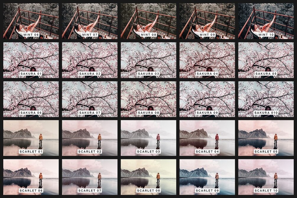 10 Sakura Presets - Pink, dark blue, and dark green tones.